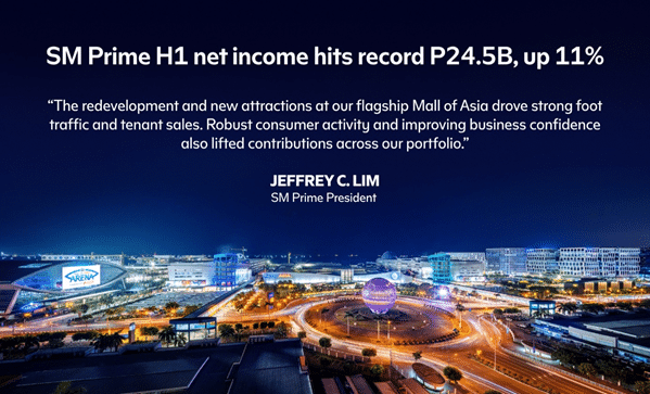 Pasay City, Philippines [August 04, 2025] – SM Prime Holdings, Inc. (SM Prime), one of the largest integrated property developers in Southeast Asia, recorded an 11% rise in first-half net income from P22.1 billion to an all-time high of P24.5 billion, driven by higher rental income, real estate sales and ancillary revenues.